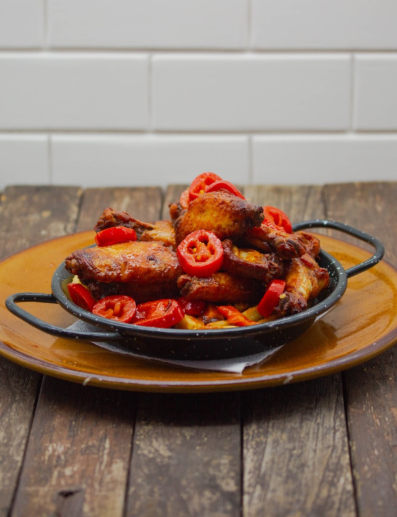 Alitas de pollo acompañadas de patatas fritas, jalapeños y salsa ranch.