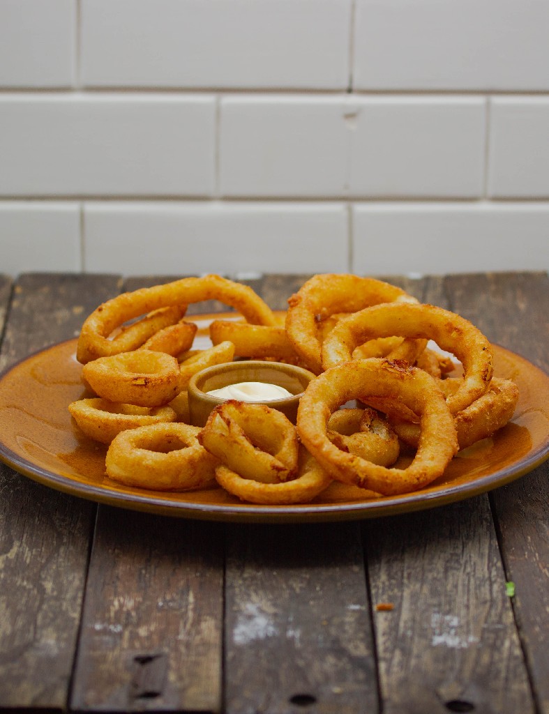 Aros de cebolla fritos acompañados de salsa ranch.