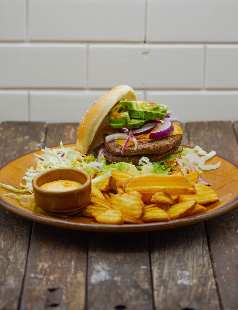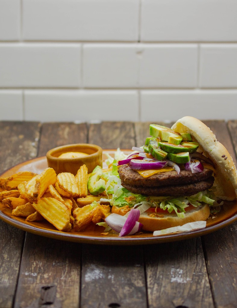 Hamburguesa de 220 g con guacamole, queso, tomate, cebolla roja, lechuga y salsa bourbón.