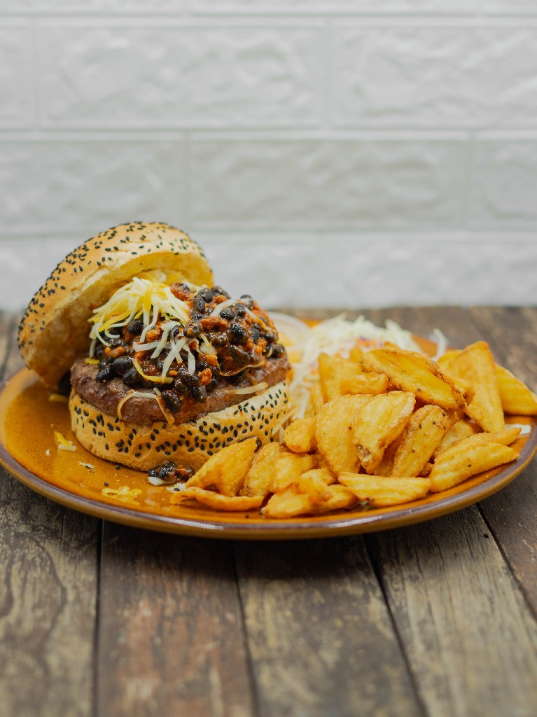 Hamburguesa de 220 g con chile y queso.