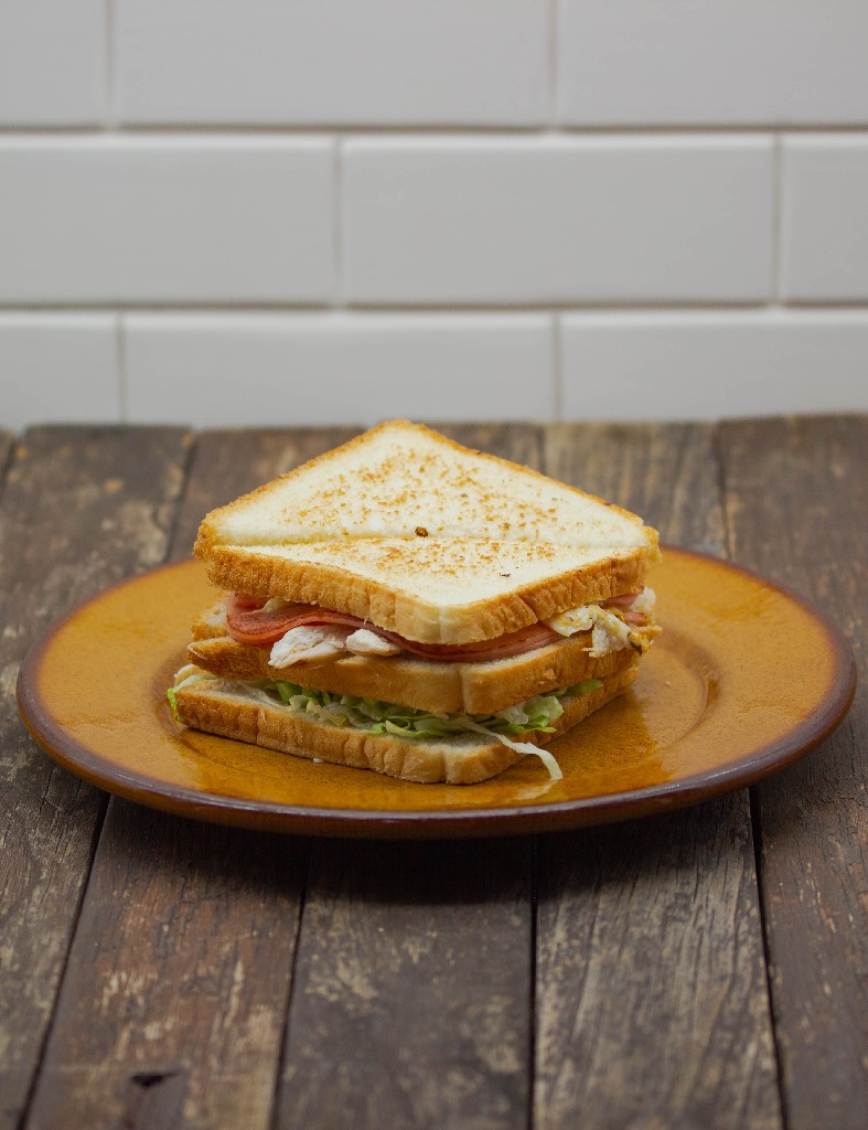 Jamón, queso, bacon, huevo, lechuga, tomate, pollo y mayonesa entre tres rabanadas de pan de molde.