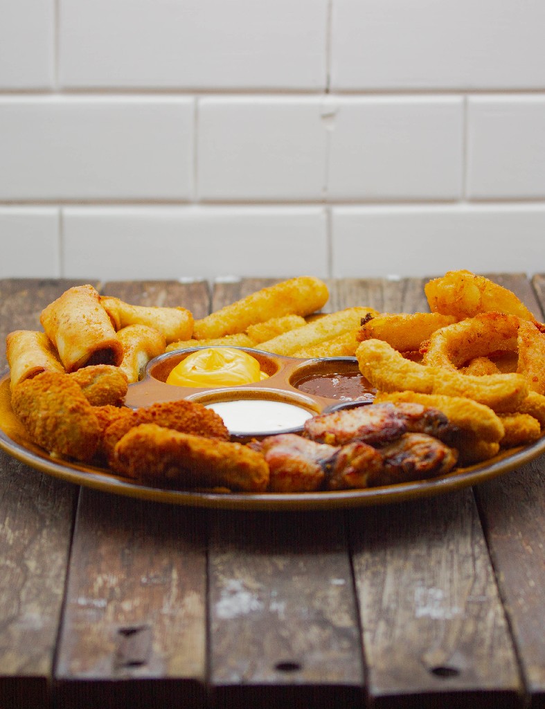 Sticks de mozarella, jalapeños cheddar, flautas de pollo, alitas de pollo, fingers de pollo, aritos de cebollas y tres salsas.