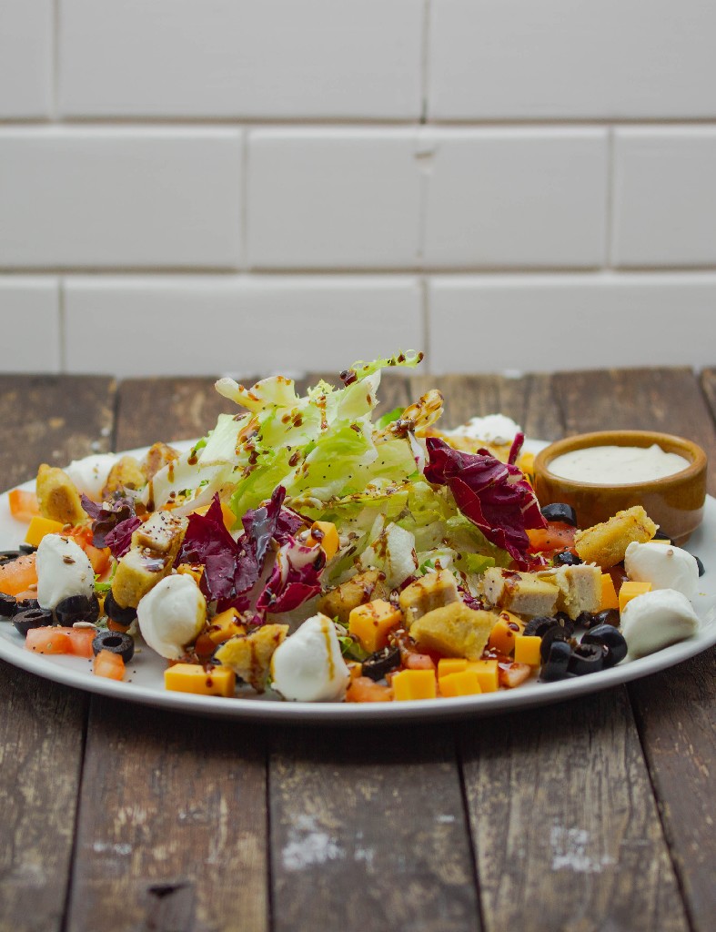 Mezcla de lechugas, tomate, pollo crujiente, perlas de mozzarella, pipas de girasol, olivas negras y salsa parmesana.