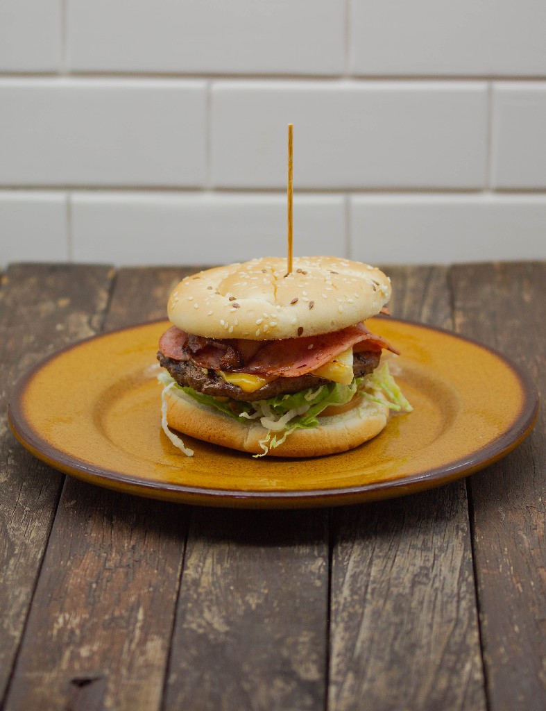 Hamburguesa de 110 g con jamón, queso, bacon, huevo, lechuga, tomate, cebolla, pepinillo y salsa burger.