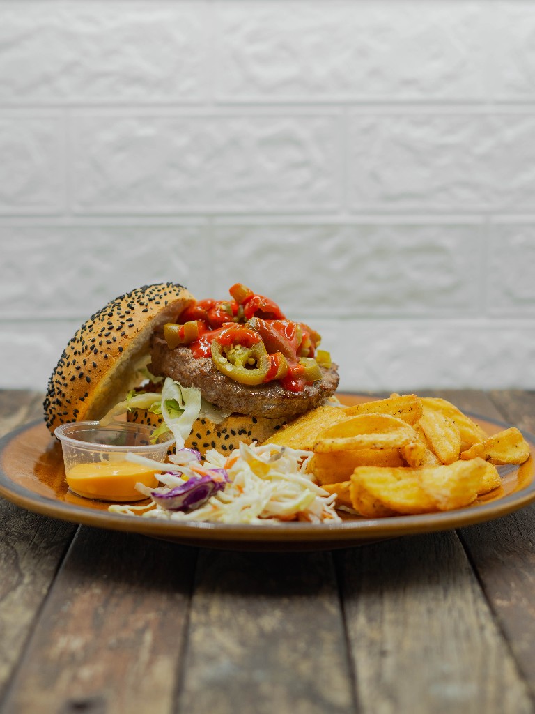 Hamburguesa de 220 g con jalapeños, salsa luisiana, lechuga, tomate, cebolla y salsa burger.