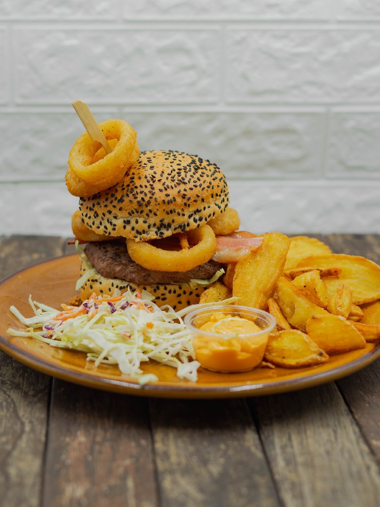 Hamburguesa de 220 g con aritos de cebolla, queso, bacon, cebolla, lechuga, tomate, pepinillos y salsa burger.