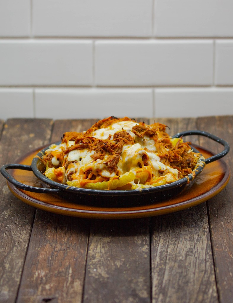 Patatas fritas acompañadas de salsa gaucha, pull pork y mezcla de quesos.