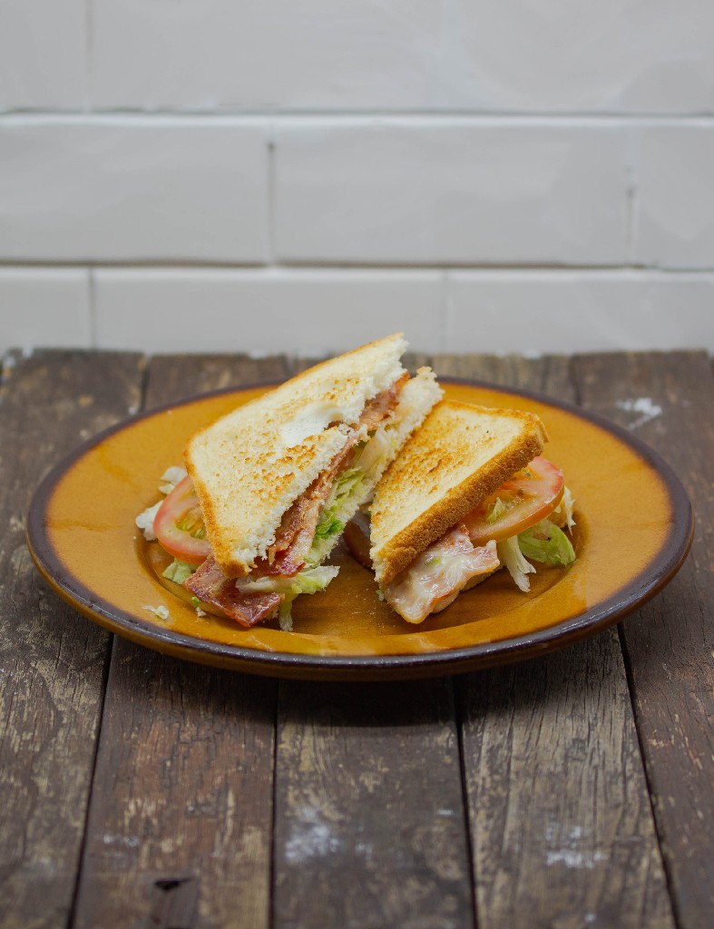 Bacon, lechuga y tomate entre dos rebanadas de pan de molde.