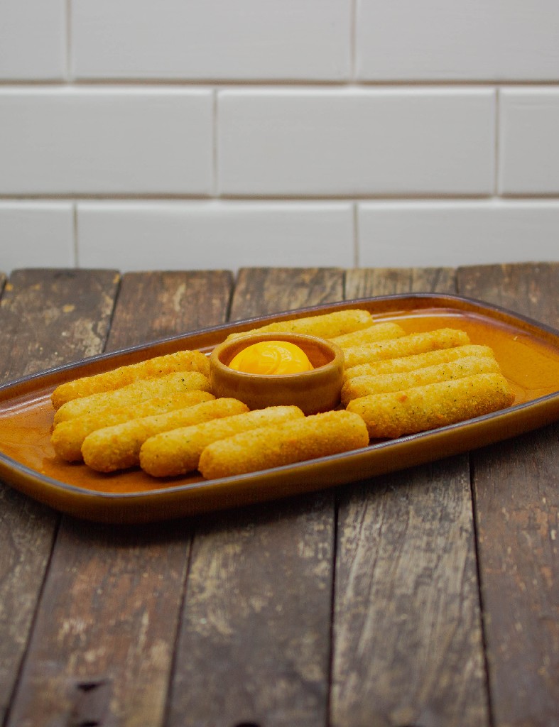 Sticks de mozzarella acompañados de salsa cheddar.