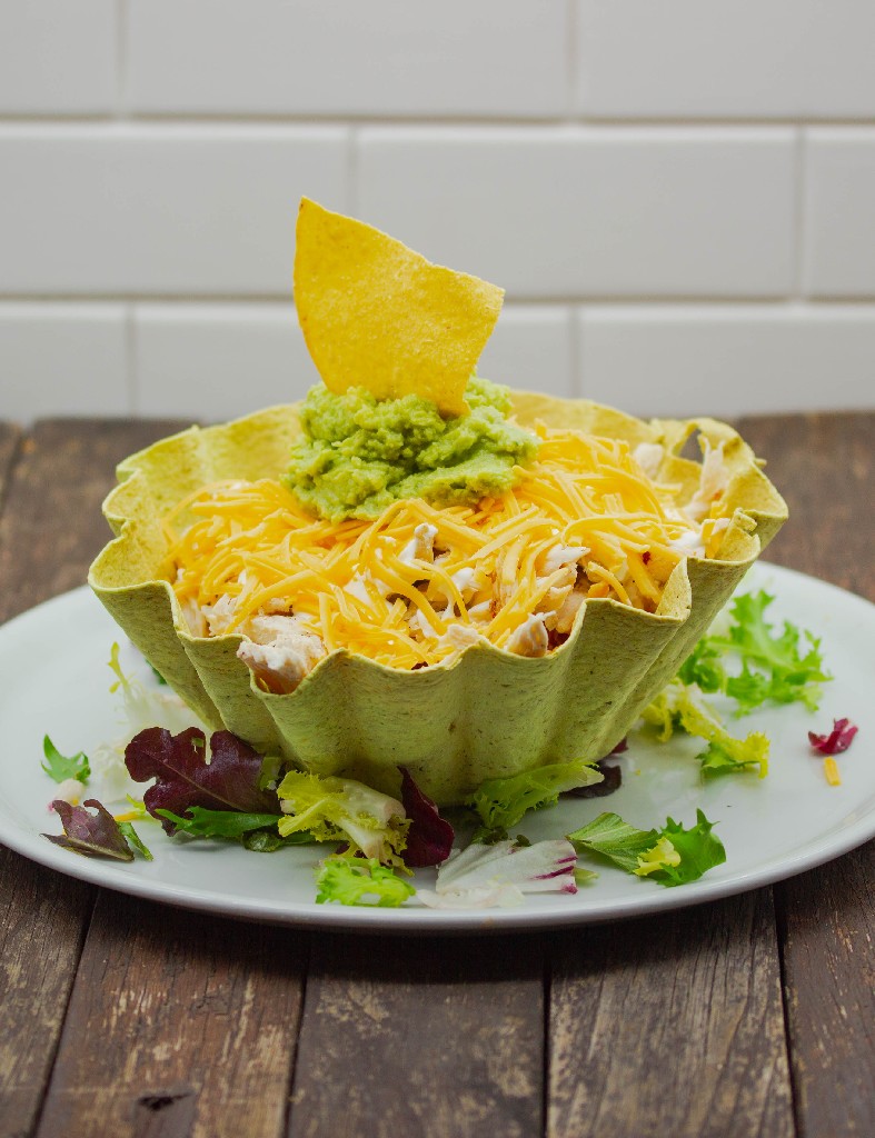 Lechuga, tomate, guacamole, ternera y torta de maíz junto a una mezcla de quesos rayados dentro una torta de trigo crujiente.